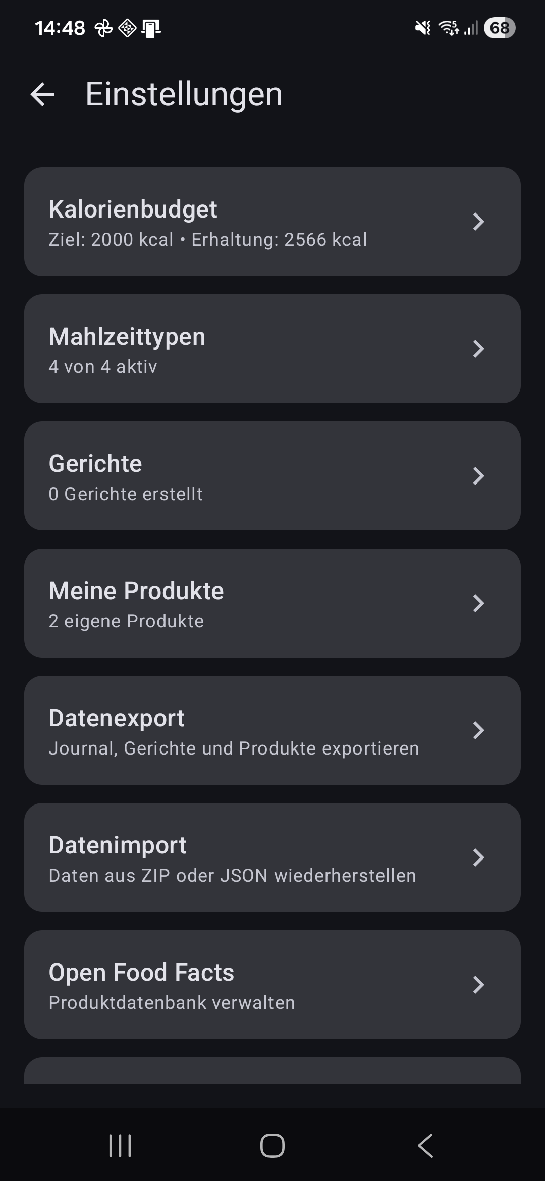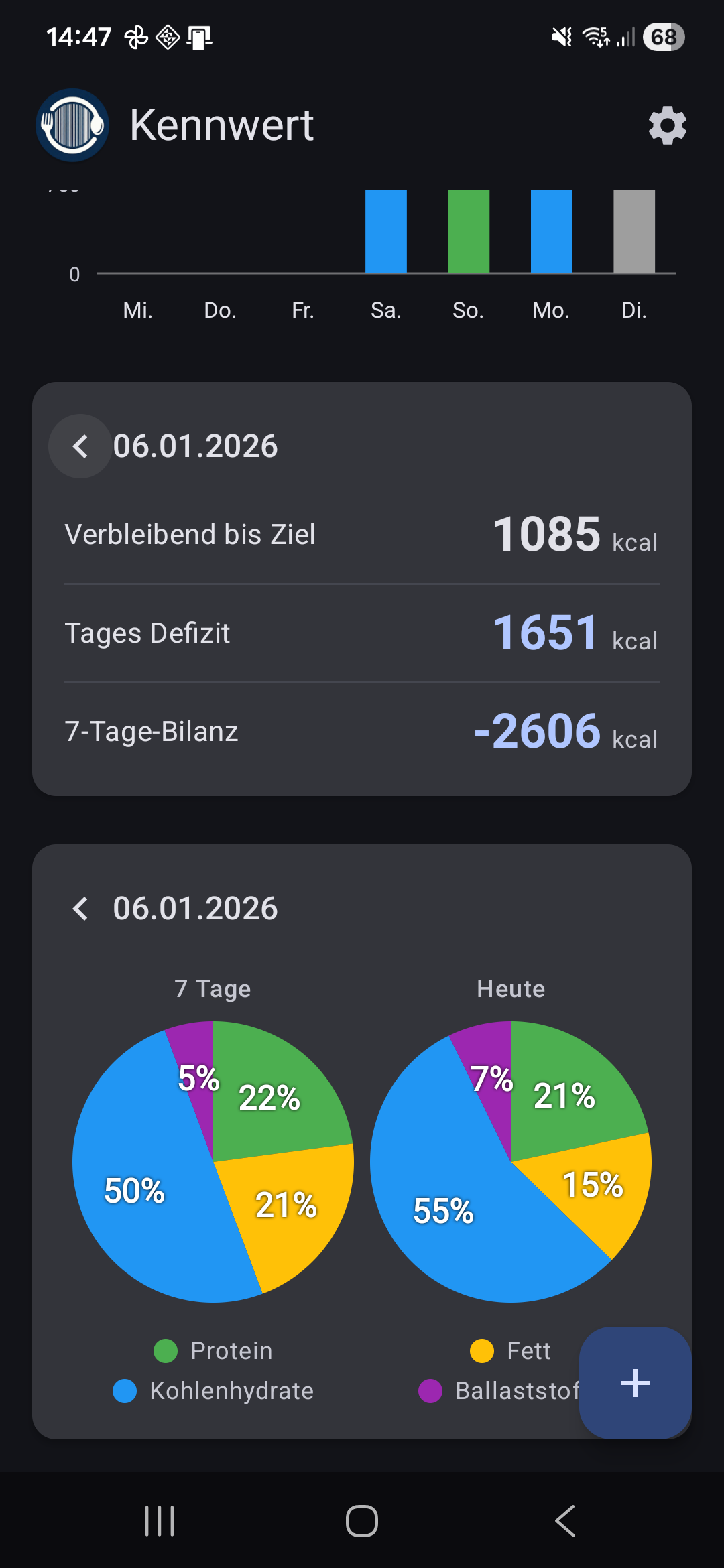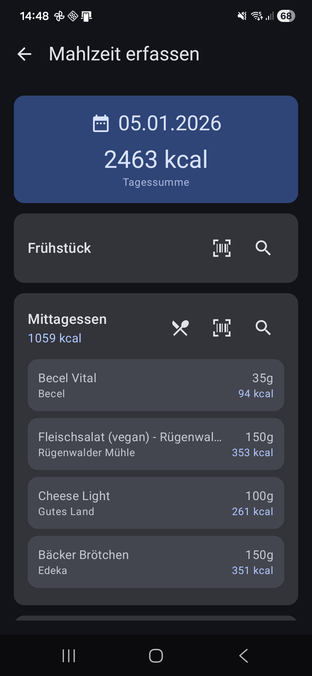 Zugriff auf eine umfangreiche Datenbank. Suche per Barcode oder Text. Erstelle eigene Gerichte.